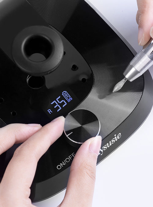 2. In order to meet the requirements of professional manicurists, this product is designed to have an adjustable rotation speed of 0-35000 rpm. Please slowly adjust it from low speed to a higher speed that you like when you are using it. Do not adjust it to the highest speed all at once to prevent the improper operation from hurting your nails.