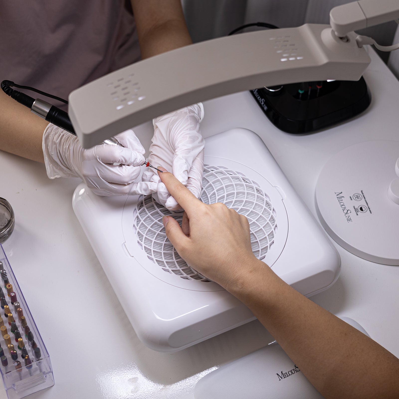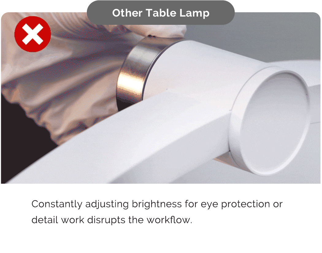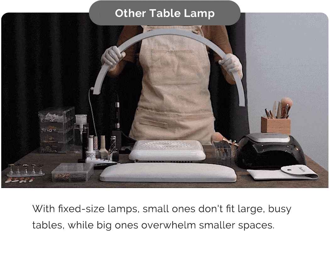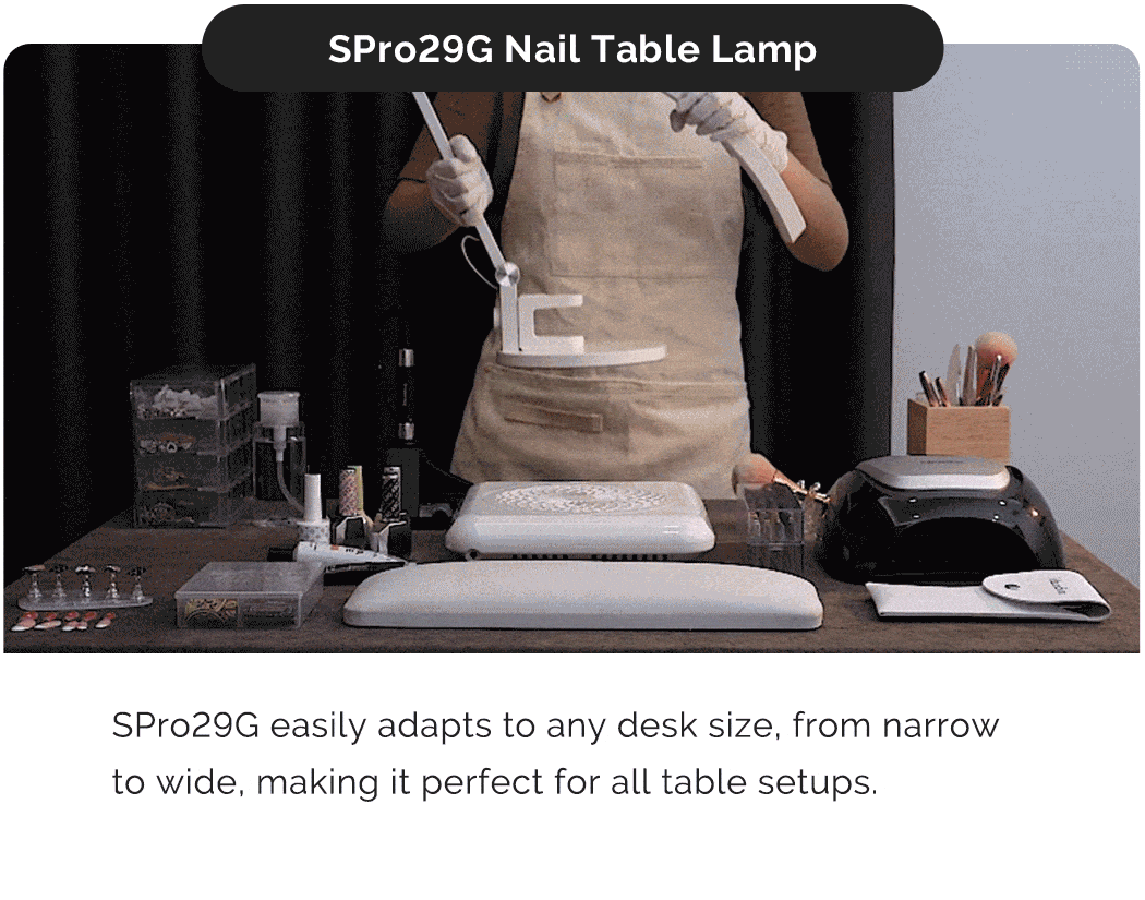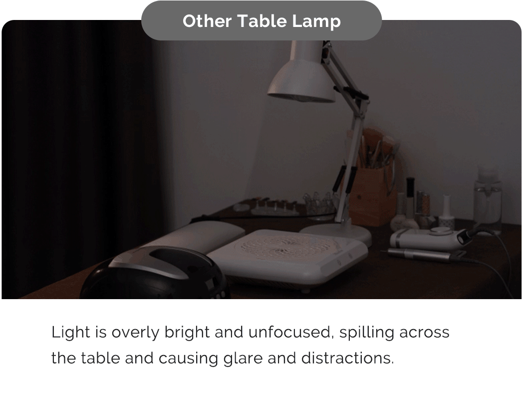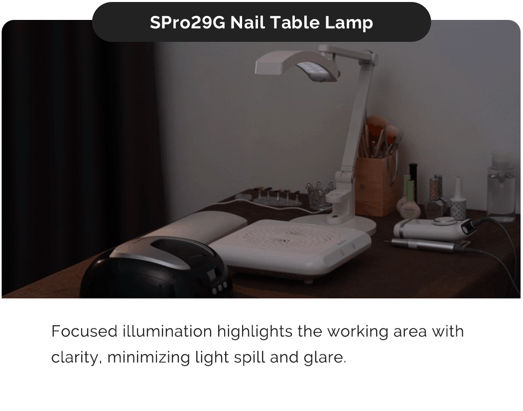 The long, inward-curved lamp head delivers soft, even illumination across the full hand, reducing shadows and eye strain. Ideal for routine tasks like prepping, shaping, and polishing.