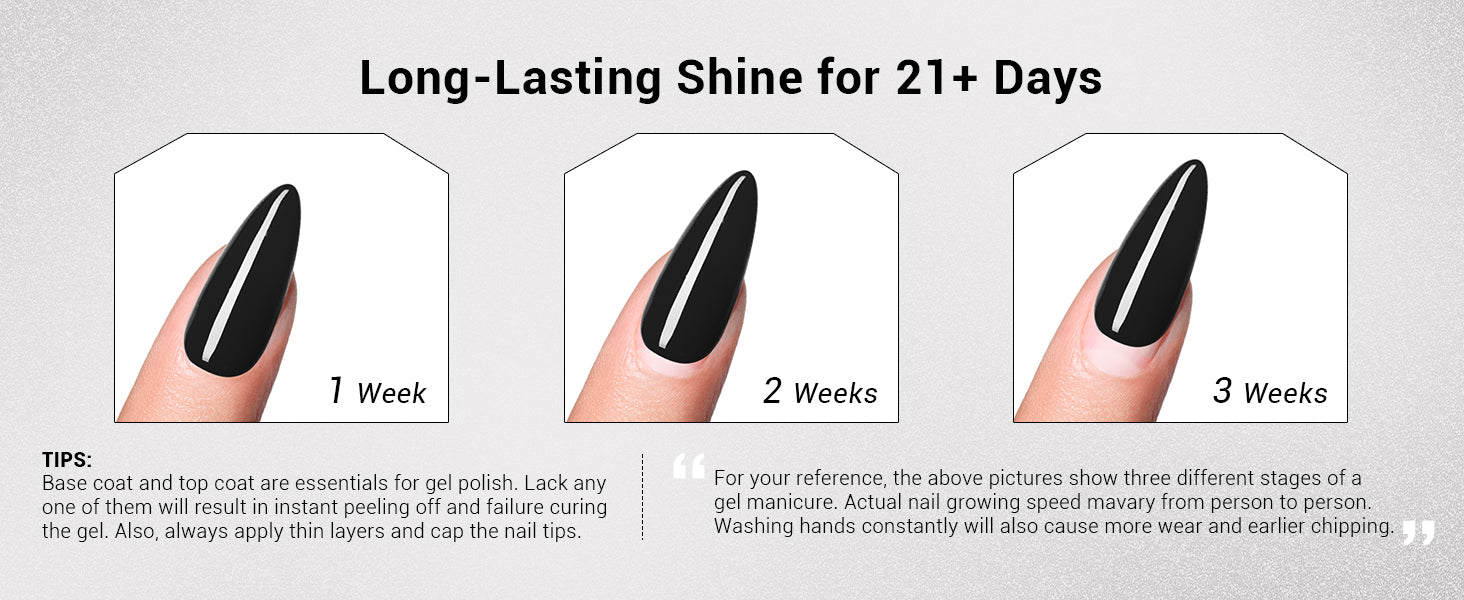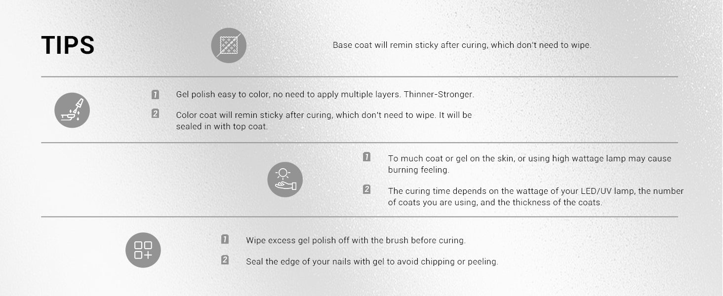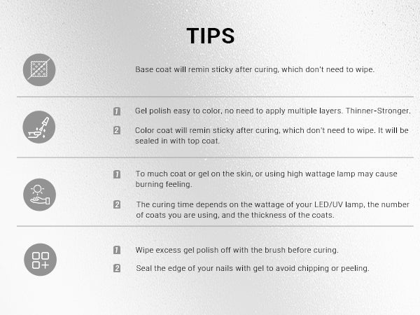 Note: Our gels are not HEMA FREE. Only used for nail and Non-direct contact with the skin. Wash immediately if contact occurs. May cause an allergic reaction by skin contact. Read directions for use carefully. Only used for nails. Avoid contact with eyes, mouth, and skin. Rinse them immediately should the product comes into contact with them. If there is any incident, contact the doctor immediately. Stop using the product if redness and itching develop. If the symptom persists, consult a doctor. Keep the products away from children.