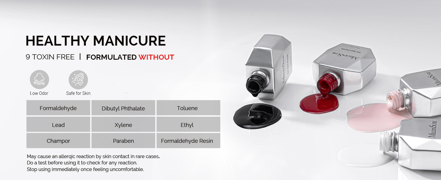 Note: Our gels are not HEMA-Free. Only used for nail and Non-direct contact with the skin. Wash immediately if contact occurs. May cause an allergic reaction by skin contact. Read directions for use carefully. Only used for nails. Avoid contact with eyes, mouth, and skin. Rinse them immediately should the product comes into contact with them. If there is any incident, contact the doctor immediately. Stop using the product if redness and itching develop. If the symptom persists, consult a doctor. Keep the products away from children.