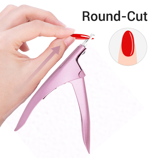 Round-Cuts are made after the tip is applied to nail. Insert tip into cutting slot of Edge Cutter. Hold cutter at a 45ยฐangle-with body of cutter toward the palm of the clientโs hand. Press handle to cut tip.