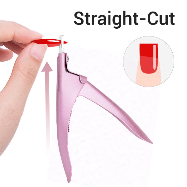 Straight-Cut is made after the tip is applied to the nail. Inserted tip into cutting slot of Edge Cutter. Hold cutter straight up and down. Press handle to cut tip.