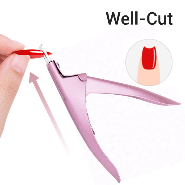 Well-Cuts are made before the tip is applied to nail. Hold Edge Cutter at 45ยฐ angle to loose tip, with the body of Edge Cutter in the palm of our hand. Insert loose tip into cutting slot of Edge Cutter and press handle to cut tip.