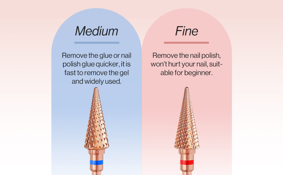 Theย drillย bitsย alsoย comeย inย 2ย differentย gritย sizesย (medium/fine)ย andย 2ย differentย colorsย (gold/roseย gold).