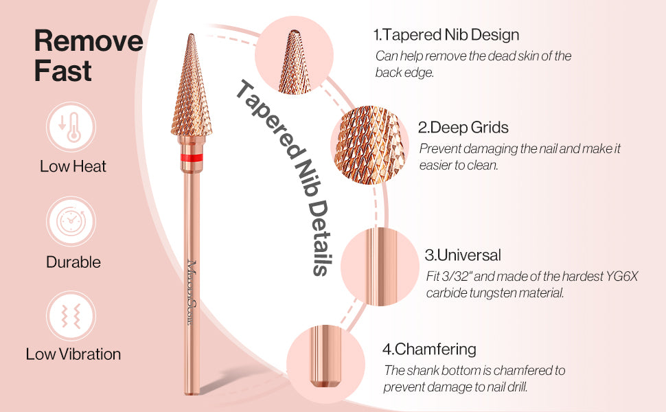 The bit is great for cleaning, preparing, shaping, shortening, and smoothing the cuticles and under the nail.
