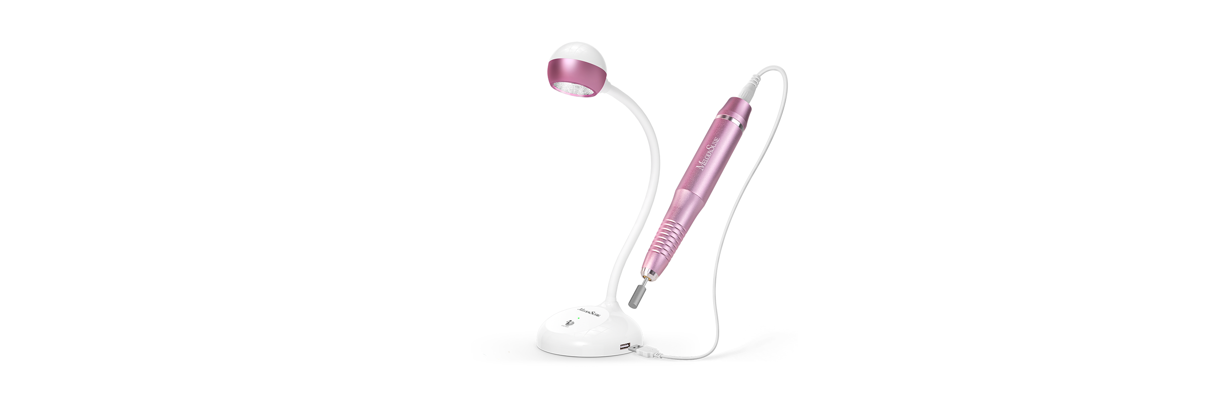 Flexible LED/ UV light, adjustable gooseneck design. Portable electric nail drill with 6 bits, 0-20,000RPM speed, and USB interface for easy use.